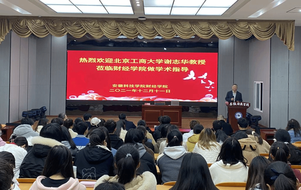2021年12月11日上午,北京工商大学原副校长、现任教育部工商管理学科指导委员会副主任委员谢志华教授应邀莅临我校财经学院指导新商科专业建设,安徽财经大学会计学院院长翟胜宝教授随行指导。谢志华在敏行楼A一楼报告厅做了题为“新技术与新商科”的学术讲座,半岛在线客服党委委员、副校长黄友锐、教务处处长赵伟峰、财经学院党政领导和全体教职工以及2021级会计学、2021级金融工程专业学生参加报告会。财经学院院长郝世绵主持报告会。