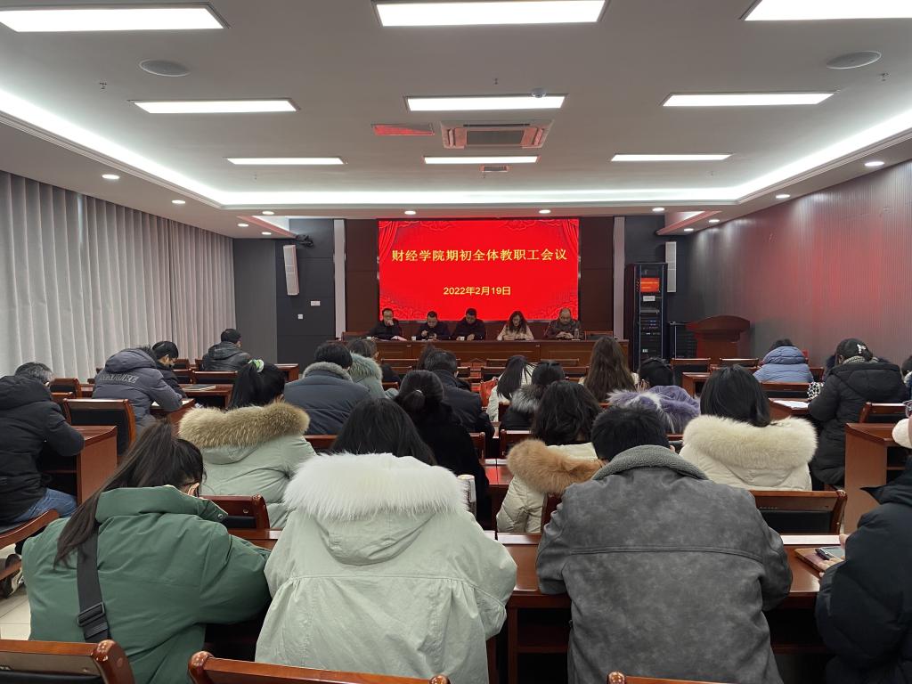 2月19日下午,财经学院在西辅楼111会议室召开新学期全体教职工大会,学院党委书记杜小明,党委副书记、院长郝世绵,党委副书记、纪委书记耿广汉,副院长李强、李宝礼及全体教职工参加了会议。会议由郝世绵主持。