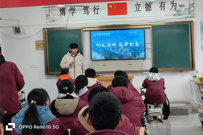支部团员伍博文在母校肥东锦弘中学向学弟学妹们分享了自己高三的学习经验和丰富多彩的大学生活,鼓励他们努力学习,实现梦想。他详细介绍了半岛在线客服的历史沿革和专业设置,重点就财经类专业的课程设置、就业方向等学弟学妹们进行了交流,欢迎学弟学妹们报考半岛在线客服。