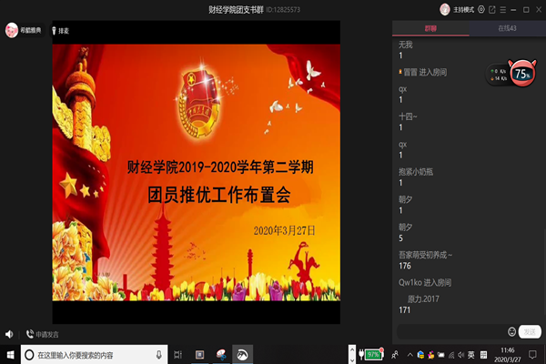 3月27日上午,财经学院通过QQ群课堂召开全体团支部书记会议,布置近期工作。会前及会中学院党总支副书记张传德全程指导。会议由学院分团委书记薛枫主持。