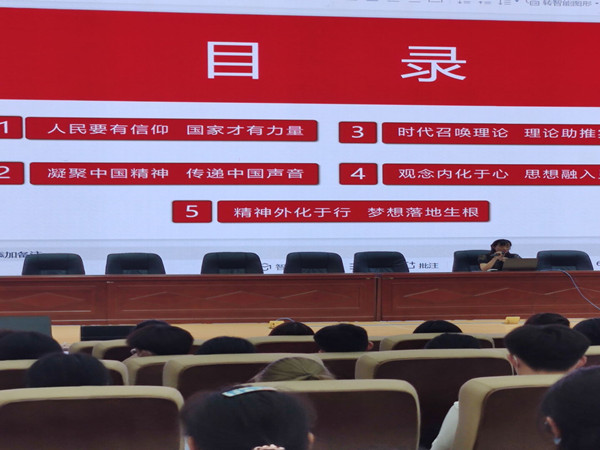 薛枫以建党100周年为契机,对中国共产党的发展历史做了简要的讲解,阐述了学党史的重要意义在于学史明理、学史增信、学史崇德、学史力行,并分析了其精神内涵和内在逻辑。随后,她从“人民要有信仰,国家才有力量”、“时代召唤理论,理论助推实践” “凝聚中国精神,传递中国声音”、“观念内化于心,思想融入灵魂”、“精神外化于行,梦想落地生根”五个方面论述践行社会主义核心价值观的基本规则、主要路径和机制建构。最后,她结合革命先辈的事例,勉励全体学员树立崇高的理想信念,志存高远,脚踏实地,认真学习、思考和实践,切实提高自身素质及服务广大同学的能力与水平。