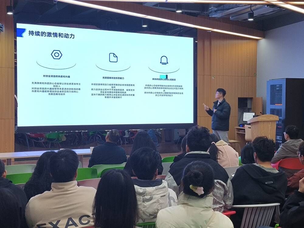 程健首先从在校时相关专业的学习和创业过程具备的基本品质两个方面展开,结合自己的创业经历,强调持续学习的能力、激情和动力是坚持不懈追求目标的基础;接着分享了自己从校园走向工作岗位、从工作岗位到创业者身份的转变,强调坚持自律、自我发展与提升的重要性;最后分享疫情期间制作血氧心率检测模块,利用风口设计出市场需要的产品,为多家企业提供原产品部分零件,最终实现产品大批量生产的创业故事。