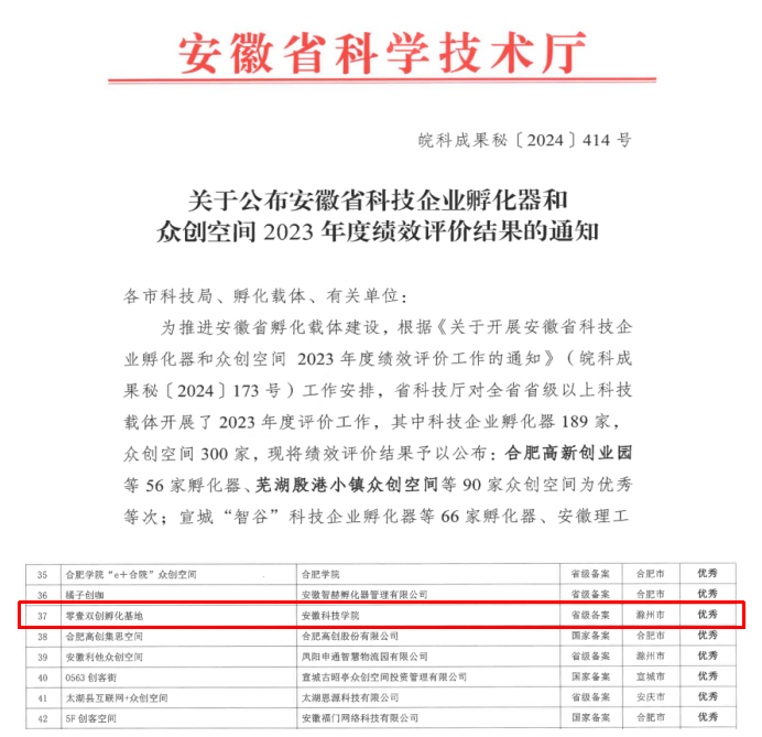 近日,安徽省科学技术厅发布《安徽省科技企业孵化器和众创空间2023年度绩效评价》结果,我校运营的省级众创空间“零壹双创孵化基地“获“优秀”等次。这是继2022年荣获优秀等次后,再次获此殊荣!