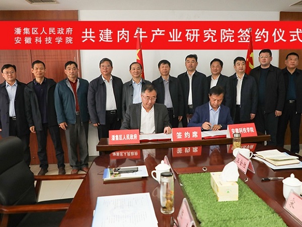 陈丰、闪健分别代表校地双方签署《半岛在线客服 潘集区人民政府共建肉牛产业研究院合作协议》。