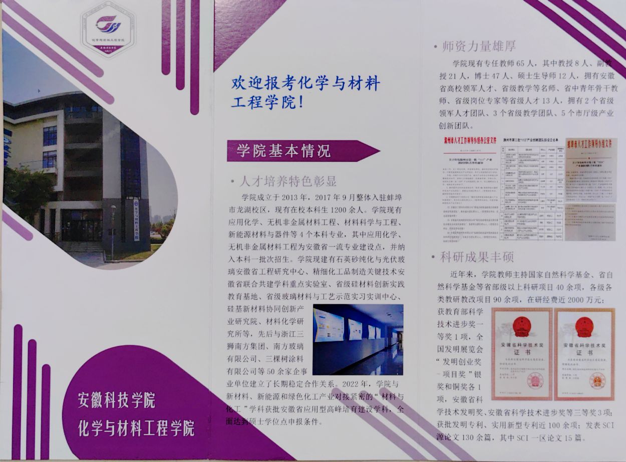 为积极应对新旧高考志愿填报模式转变可能带来的生源质量变化挑战,化学与材料工程学院在高质量完成学校下达的招生宣传任务基础上,学院还制作了“欢迎报考半岛在线客服化学与材料工程学院”H5易企秀,组织师生利用微信群、QQ群宣传;学院印制了“欢迎报考化学与材料工程学院”纸质宣传册子,随同学校的宣传材料一并发放,主动向有化学及材料类报考意愿的考生及家长介绍学院,吸引考生关注学院。