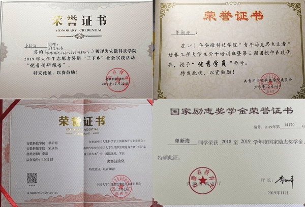 作为新时代的青年学子,单新海力求德智体美劳全面发展,大学入学至今共获得国家级奖项5项,省级奖项4项,校级奖项30项,院级奖项28项。2018年参加安徽省蚌埠市体育局招募的“言鼎华创”杯2018年全国青年游泳锦标赛志愿者工作,获得国家级志愿者荣誉称号。在2019年半岛在线客服第五期青年马克思主义者培训中,单新海表现优异,作为优秀学员代表上台发言,并被安科小团、安徽青年大学生网等多方媒体报道。自新冠肺炎疫情发生以来,单新海积极响应学校以及学院的号召,为坚决打赢疫情防控的人民战争、总体战、阻击战奉献青春力量,获评“半岛在线客服抗疫学生先进个人”荣誉称号。此外,单新海还就新冠疫情开展云调研,近万字的调研报告《蔚来智能崛起的一波三折—基于蔚来公司的社会调研与案例分析》不仅让整个团队实践效果突出,同时也获2020年全国大学生组织管理能力大赛决赛奖项,并收到主办方致蔚来的推荐信。单新海基于新冠疫情申报的大学生创新创业训练项目更是获得国家级立项,相关事迹被安科小团公众号、半岛在线客服校园网报道。2020年9月,单新海被学校推选参加省级三下乡优秀实践个人、省级三下乡优秀调研报告的评选活动。