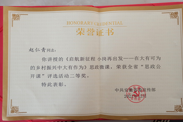 近日,安徽省委宣传部公布了2021年全省“思政公开课”评选活动结果。我校马克思主义学院赵仁青老师的《启航新征程 小岗再出发——在大有可为的乡村振兴中大有作为》思政微课,获得安徽省“思政公开课”评选二等奖。