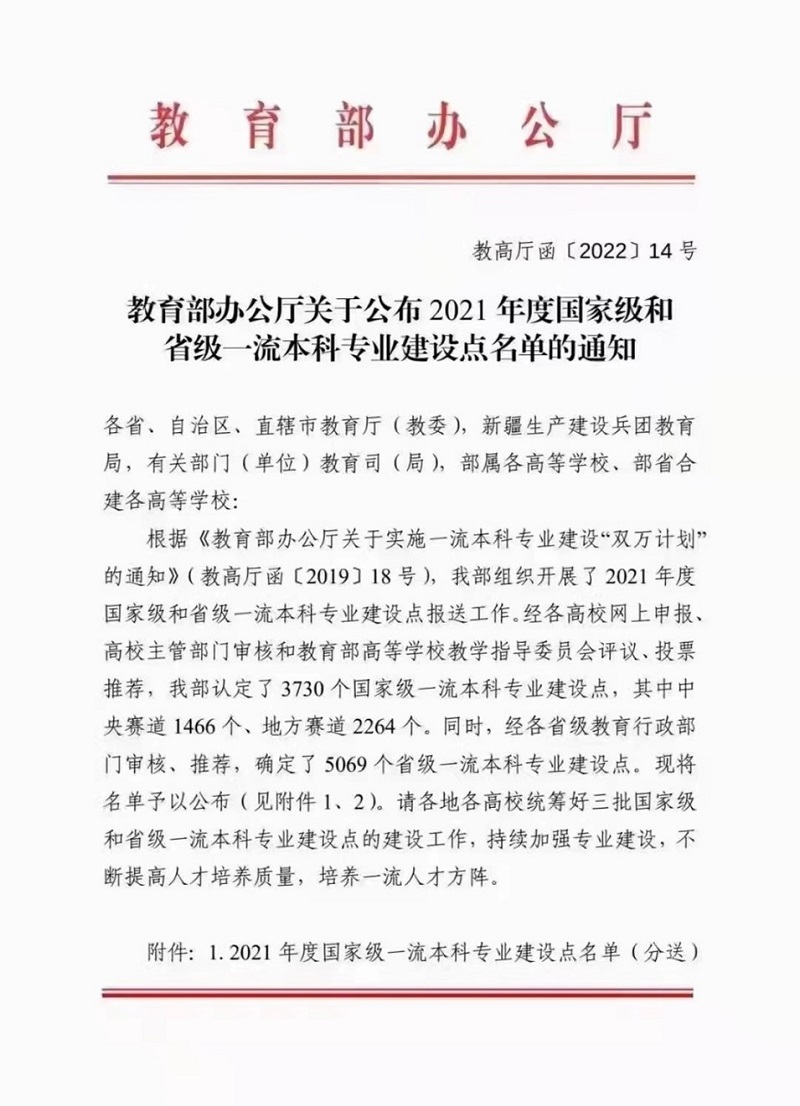 近日,教育部印发了《教育部办公厅关于公布2021年度国家级和省级一流本科专业建设点名单的通知》(教高厅函〔2022〕14号),正式公布2021年度一流本科专业建设“双万计划”(国家级和省级一流本科专业)建设点名单,认定了3730个国家级一流本科专业建设点和5069个省级一流本科专业建设点,我院动物医学专业入选国家级一流本科专业建设点。