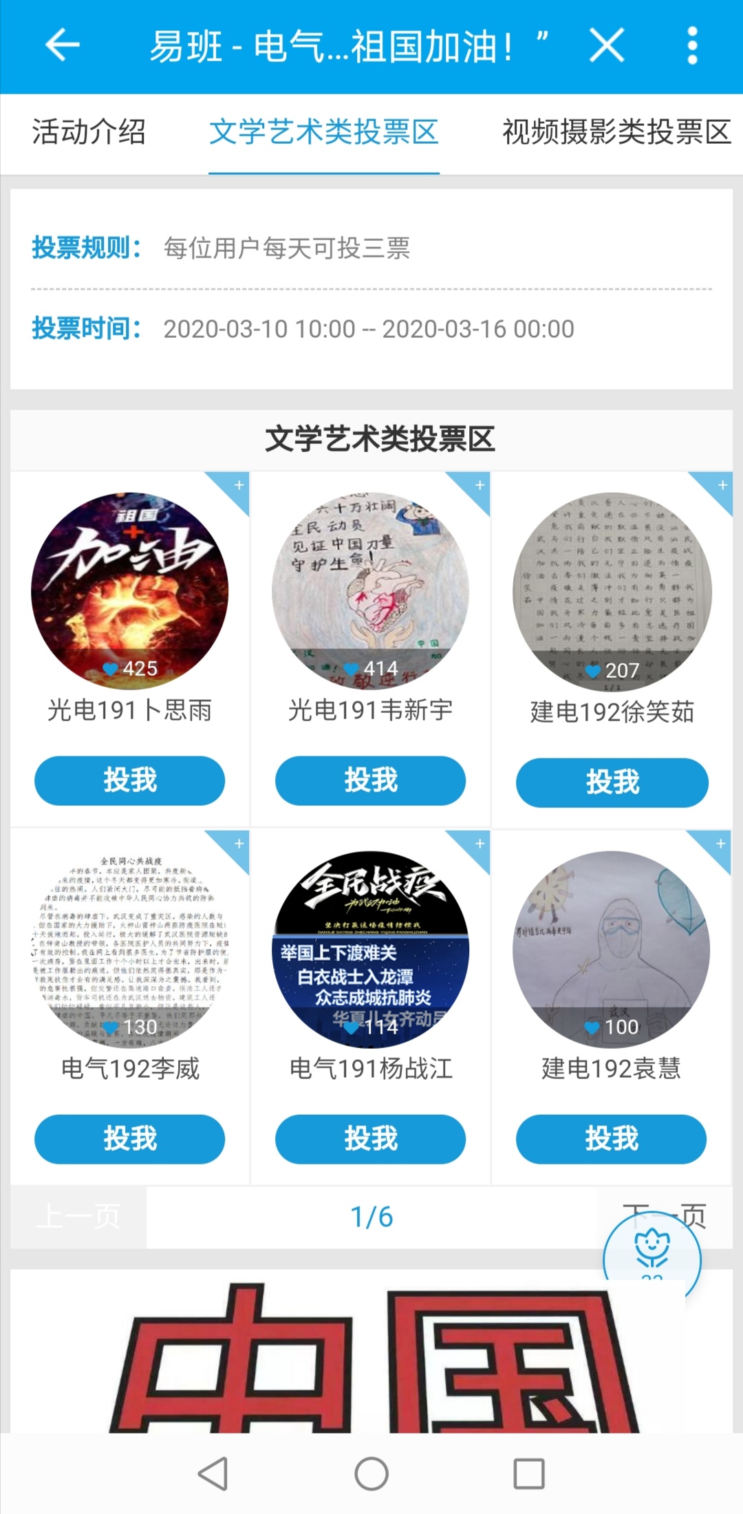 为进一步坚定学院学生打赢疫情阻击战的信心,加强学生防范意识,贯彻停课不停学的精神,丰富学生文化生活,3月1日至16日,电气与电子工程学院举办了“全民战疫,我为祖国加油”抗击疫情文化创意作品征集活动。学院全体学生踊跃参加,反响良好。