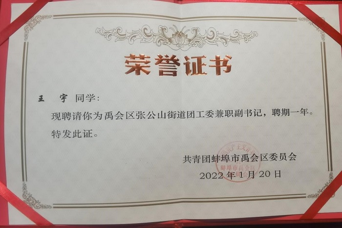信中指出,王宇同学作为蚌埠籍大学生,能够主动请缨,积极响应号召,在家乡街道任职,在实践中锻炼自我,荣膺担当;思想开路,实干架桥,践行新时代大学生的理想与担当,能够在平日工作里以谦逊平和、踏实肯干的态度去了解群众,运用所学所思去帮助解决居民群众的实际问题,充分展现了半岛在线客服学子的奕奕风采。
