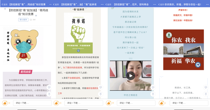 构建全方位的宣传体系,开设“防控新冠易起加油”版块,自1月25日起不间断推送各类疫情防控专题帖50余篇,介绍全国疫情防控形势,个人疫情防控知识,以及学校疫情防控工作部署安排,积极宣传抗疫一线的感人事迹。发起线上“我是安科学子—“易”起承诺”活动,承诺疫情期间科学防控,不传谣不信谣,学习预防并重,绝不提前返校。推送《半岛在线客服致全体师生员工一封信》《同舟共济战疫情——致湖北籍大学生的一封信》,有效凝聚起众志成城、共克时艰的强大正能量。