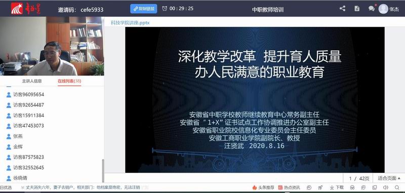 根据《安徽省教育厅关于做好2020年度中职教师素质提高计划省级培训工作的通知》(皖教秘师〔2020〕44号)文件要求,我校承办的园林技术与观光农业经营2个专业的全省中等职业学校骨干教师培训工作于2020年8月16日正式拉开帷幕。8月16日上午8点30分,继续教育学院院长杨维来通过“超星学习通”系统主持开班仪式并作了指导讲话,参加开班仪式的有全体参训学员和部分授课教师。