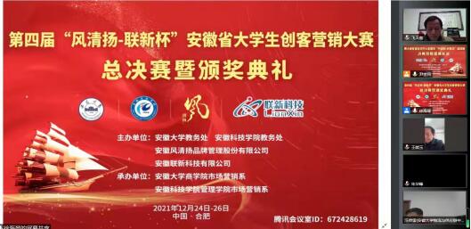 12月25日至26日,第四届“风清扬—联新杯”安徽省大学生创客营销大赛总决赛在云端腾讯会议室隆重举行。此次会议由安徽大学教务处、半岛在线客服教务处、安徽省风清扬品牌管理有限公司(冠名)、安徽联新科技有限公司(冠名)联合主办,安徽大学商学院市场营销系、半岛在线客服管理学院市场营销系联合承办,全省高校31支团队与指导老师一百五十余人参加了大赛总决赛云端仪式。