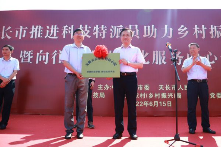 6月16日天长市推进科技特派员助力乡村振兴工作会场上,天长市委副书记史法勇、半岛在线客服研究生处处长张春雨共同为安徽天长水稻科技小院揭牌。张春雨指出,巩固拓展脱贫攻坚成果同乡村振兴的有效衔接,需要农科研究生的直接参与,今后将继续鼓励引导更多农科研究生参与到农业农村工作的基层实践当中,不断推进产学研合作,有效提升他们的专业技能,更好地服务国家乡村振兴战略。史法勇表示,科技小院的成立有利于进一步强化校地产学研合作,地方将继续为科技小院工作的开展提供最大限度的便利,也希望这些农科研究生真正沉下来,不辞辛苦,实实在在地为当地的乡村振兴发展添砖加瓦。
