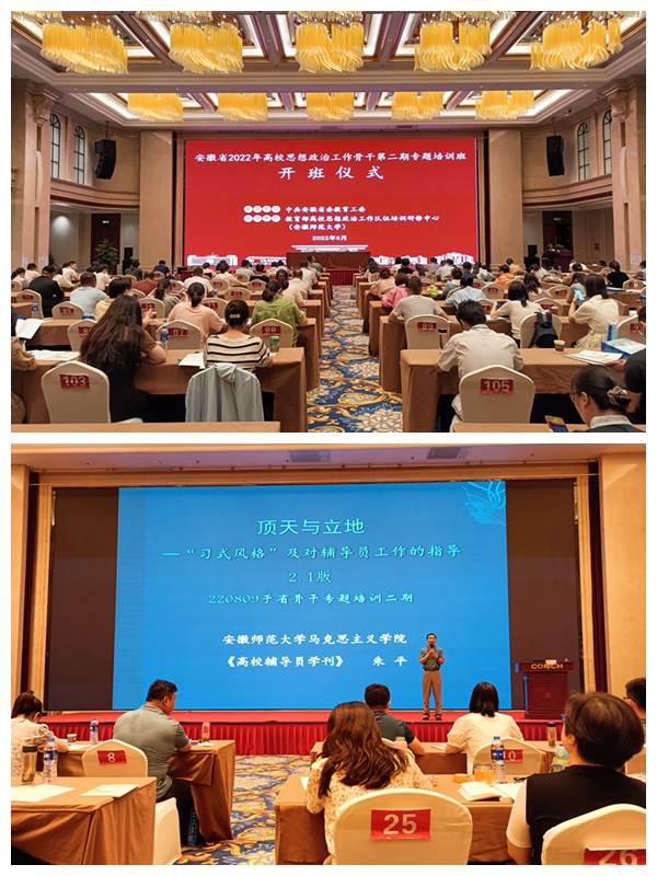 聚焦高校思想政治工作骨干素养提升。我校选派辅导员参加2022年安徽省高校思想政治工作骨干第二期专题培训班。培训班上,朱平、钟小要、胡靖、路炳辉、陈九如等专家分别作《顶天与立地—用“习式风格”指导辅导员工作》《新时代高校学生工作的守正创新》《新时代高校辅导员的思想方法与工作方法》《高校思政工作者科研的若干问题》《高校思想政治工作的新形势与新任务》等专题讲座。此次培训让参训教师进一步了解了高校思想政治工作的新形势、新任务,学习掌握了新时代辅导员工作的思想方法和工作方法,有利于促进辅导员的工作能力提升和助推辅导员工作守正创新。