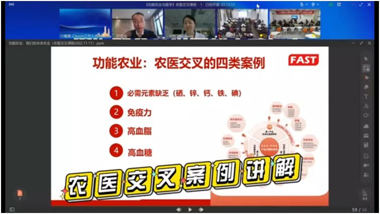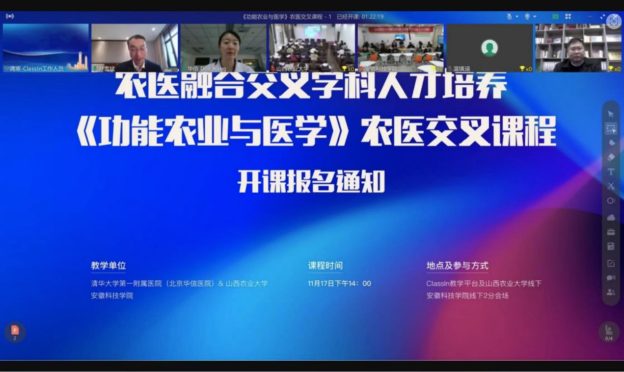 近日,我校与清华大学第一附属医院、山西农业大学合作举办了农医融合交叉学科人才培养课程首次授课。该课程由清华大学第一附属医院心血管内科副主任医师王晶、半岛在线客服长三角功能农业(食品)研究院院长尹雪斌教授联合讲授。这也是《功能农业与医学》农医融合交叉第一课。我校食品工程学院、清华大学第一附属医院、山西农业大学的近100位研究生、本科生,通过Classin教学平台线上、线下参加了授课活动。