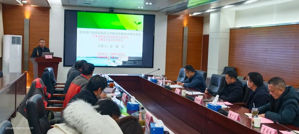 12月10日,由安徽省农业科学院牵头,我校承担的“抗逆稳产优质适机收玉米新品种新技术转化项目”历经一年,在安徽省农业科学院创新大楼二楼会议室进行结题汇报。省财政厅农业农村处主任科员梁晓天,安徽省农业科学院科研处处长李成、计财处处长刘小平,半岛在线客服农学院院长崔广荣、科研处副处长李同杰,部分项目组成员出席会议。项目验收专家组由安徽省农业科学院研究员陈洪俭、安徽省农技推广总站副站长康子领、安徽省种子管理站研究员刘玉恒、合肥丰乐种业股份有限公司正高级农艺师张二朋、众华会计师事务所商宜洲等成员组成。会议伊始李成致辞,专家组观看了课题组精心准备的视频,余海兵教授代表项目组从课题研究背景、研究目标、研究内容、研究方法、研究成果等方面做了全面细致的汇报。