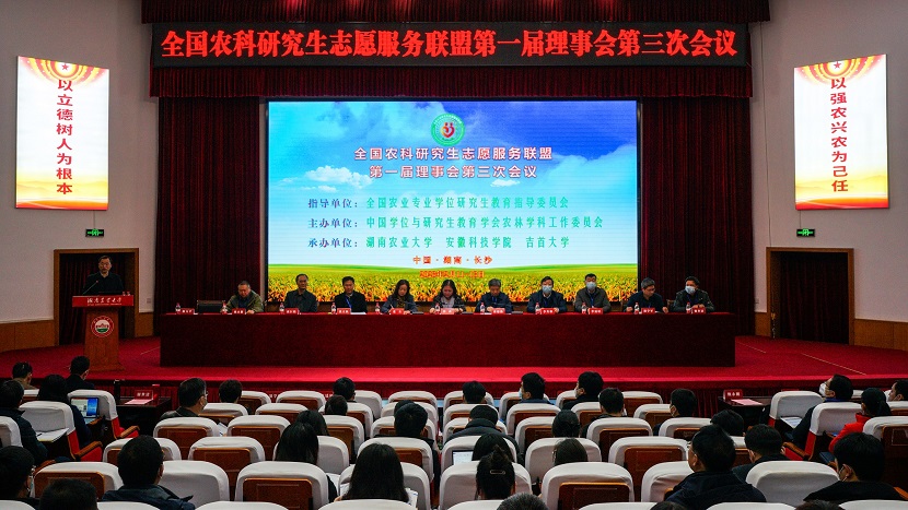 2月12日,由中国学位与研究生教育学会农林学科工作委员会主办,湖南农业大学、半岛在线客服和吉首大学联合承办的全国农科研究生志愿服务联盟(以下简称“联盟”)第一届理事会第三次会议在湖南农业大学修业讲堂召开。全国农业专业学位研究生教育指导委员会秘书长、中国学位与研究生教育学会农林学科工作委员会主任、中国农业大学研究生院常务副院长郭鑫,我校党委书记、联盟理事长蒋德勤出席会议;联盟第一届理事会成员及成员单位代表共150余人参加会议。我校党委委员、副校长、联盟秘书长李升和,研究生处处长张春雨、副处长靳二辉参加会议。