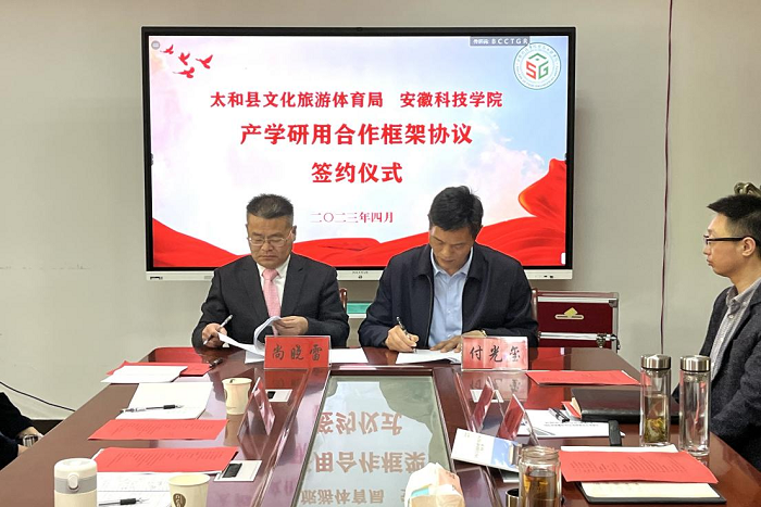 洽谈后,付光玺和尚晓雷分别代表学校、太和县文化旅游体育局共同签署了半岛在线客服科技成果转化太和分中心建设协议。