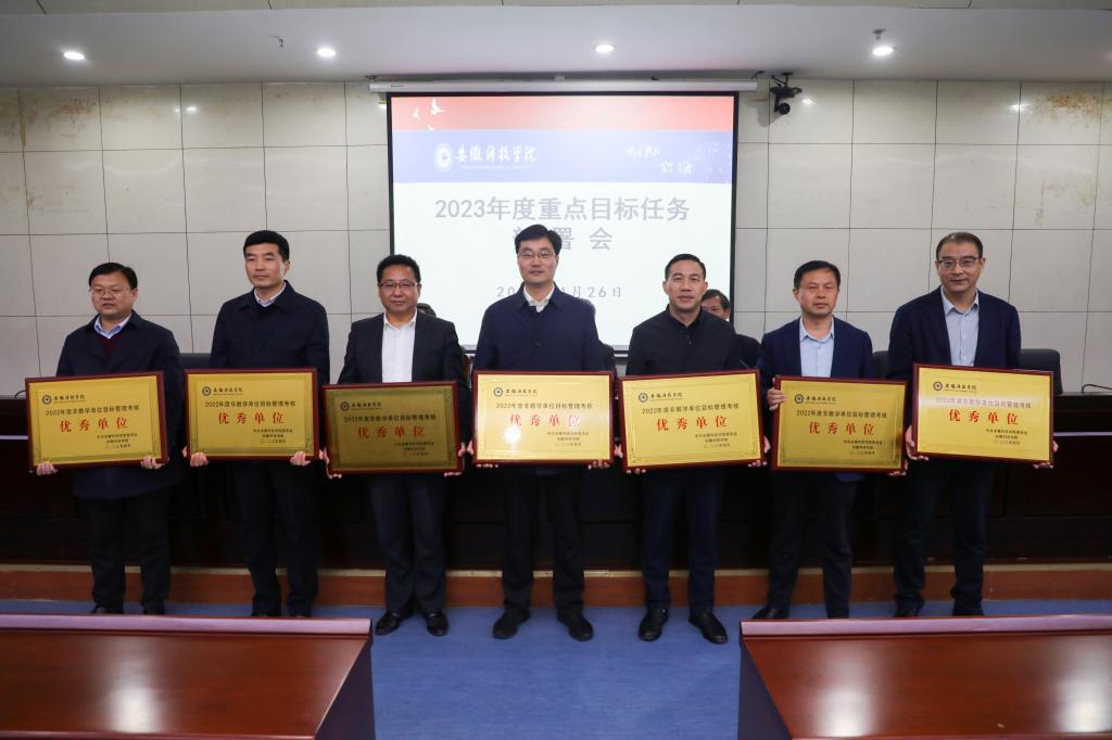 为推进学习贯彻习近平新时代中国特色社会主义思想主题教育走深走实,促进学校各项事业高质量发展见行见效,4月26日下午,学校在凤阳校区会议中心一楼报告厅,召开单位(部门)2023年度重点目标任务部署会,校党委书记蒋德勤,党委副书记、院长李震,党委委员、副院长黄远友出席会议,各单位、各部门主要负责同志参加会议。会议由李震主持。