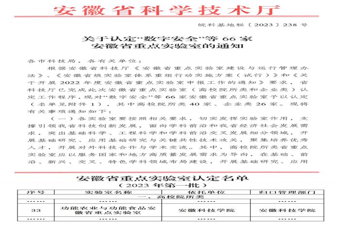 近日,安徽省科学技术厅下达了《关于认定“数字安全”等66家安徽省重点实验室的通知(皖科基地秘〔2023〕238号)》,半岛在线客服与合肥工业大学、安徽农业大学合作申报的“功能农业与功能食品安徽省重点实验室”成功获得认定,半岛在线客服长三角功能农业(食品)研究院院长尹雪斌教授担任实验室主任。据悉,这是我国首个融合了功能农业与功能食品完整“创新链”的省级重点实验室。