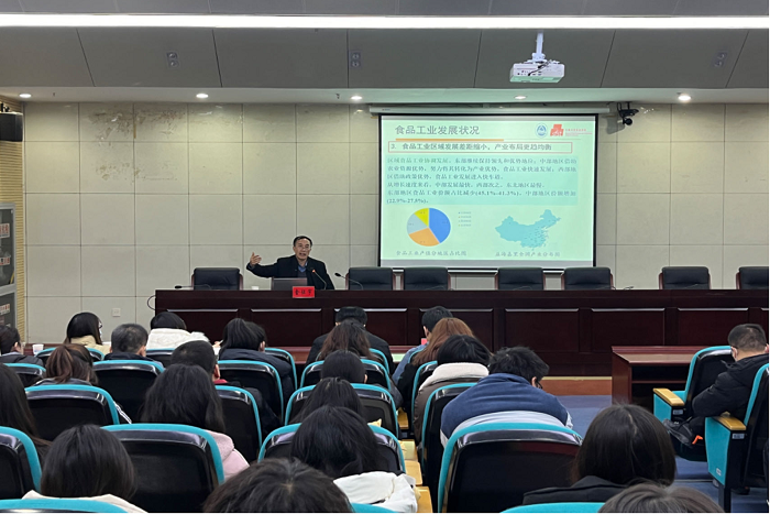 随后,金征宇院士在图书馆一楼报告厅为学校师生作学术报告,报告会由食品工程学院院长杜传来主持。金征宇院士以“我国食品产业发展状况与未来食品”为题,围绕我国食品工业发展状况及未来食品产业的发展趋势进行了详细阐述。他指出,我国食品工业发展现状有着多年连续平稳增长、区域发展差距缩小、集中度持续提高、进口呈现增长态势等特点,且由于经济发展进入新常态、新技术革命兴起、消费需求转变、未来社会发展与变迁等因素影响,食品工业面临着转型升级的新态势,只有实施科技创新驱动发展战略,才能提高食品工业核心竞争力和整体加工水平,更好地支撑食品工业持续快速发展,有效保障食品安全,更高层次地提升国民营养健康水平。他强调,面对新发展形势、新发展任务,要着眼人造肉、未来食品工厂、区块链、3D-6D打印、食品组学、精准营养等未来的新技术革命,强化对机体的营养补充和生理调控,满足人们对食品多样性和安全性的需求。