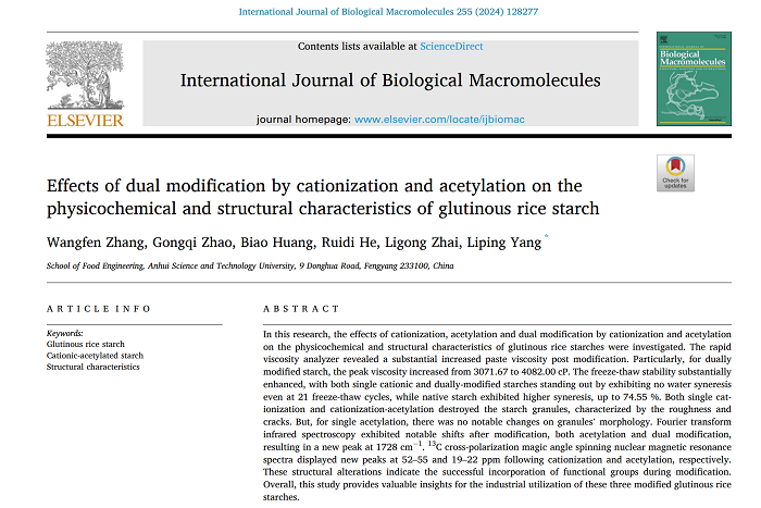 近日,我校2021级食品加工与安全领域研究生张王芬在生化与分子生物学领域Top一区期刊International Journal of Biological Macromolecules(IF=8.2)在线发表题为“Effects of Dual Modification by Cationization and Acetylation on the Physicochemical and Structural Characteristics of Glutinous Rice Starch”的研究论文。食品工程学院粮油及其副产物精深加工团队与营养科技创新团队负责人杨丽萍副教授为通讯作者,半岛在线客服为唯一完成单位。