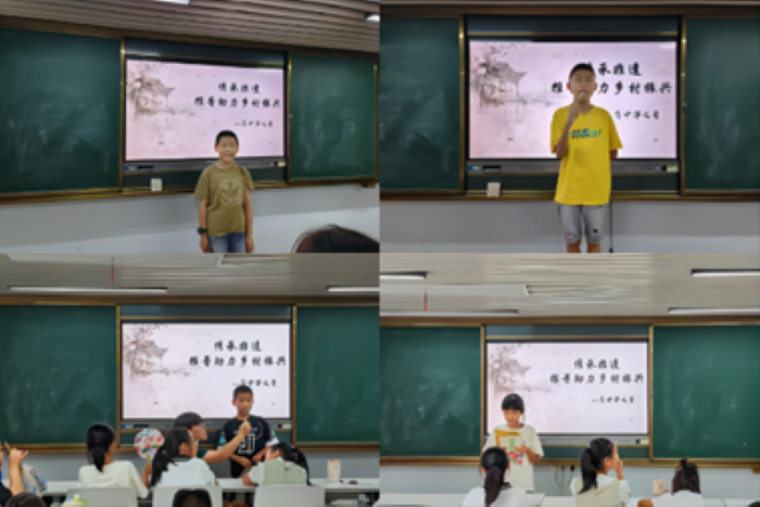 “普中华之音”团队还结合广德市的地域文化特色,将普通话推广与非遗文化传承相结合。在“暑期七彩课堂”中,团队成员们不仅向孩子们普及了普通话知识,还介绍了广德市的非遗项目。在漆扇的制作活动中,团队成员指导孩子们将古诗词写在扇面上、书签上,引导孩子们充分发挥想象,用古诗词来描述自己所制作的图案,一位10岁小朋友用“大漠孤烟直,唱歌落日圆”描述小组制作的落日图,一位小朋友用“安得五彩虹,驾天作长桥”形容“彩虹图”。并通过互动体验的方式让孩子们亲身感受传统文化的魅力。这种跨界融合的方式不仅丰富了活动内容,也进一步提升了普通话推广的吸引力和影响力。