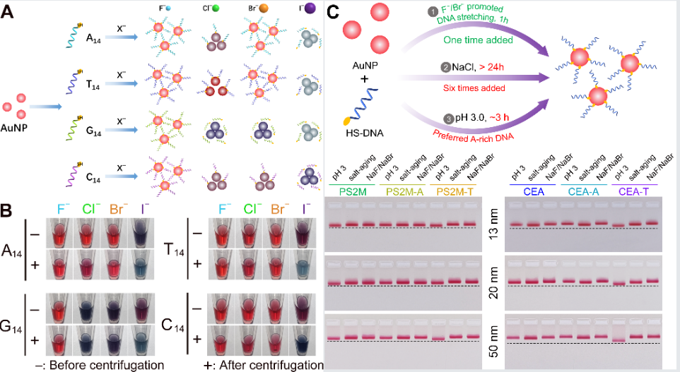文章创新性的提出了一种利用特定卤素离子(F-/ Br-)将HS-DNA通用、简便、快速修饰到AuNP表面的方法。研究发现,NaF能够提高不同碱基的DNA序列(poly A/T/C/G)修饰AuNP的稳定性;NaBr的引入有效地增加了DNA在纳米金表面的负载能力,与F-相比,Br-下的DNA负载量(密度)提高了18%~60%。因此可以根据DNA的碱基类型和试剂需要,采用适当的卤素离子调整AuNP上DNA的密度,对生物传感的应用具有重要的意义。除了NaF和NaBr的优点之外,通过引入寡聚A/T间隔序列,可以提高富含G碱基的DNA序列的修饰性能。与传统的基于NaCl的盐老化方法相比,此方法可以一次性添加高浓度(0.2 M)的盐,从而大大缩短总修饰时间至0.5~1小时。
