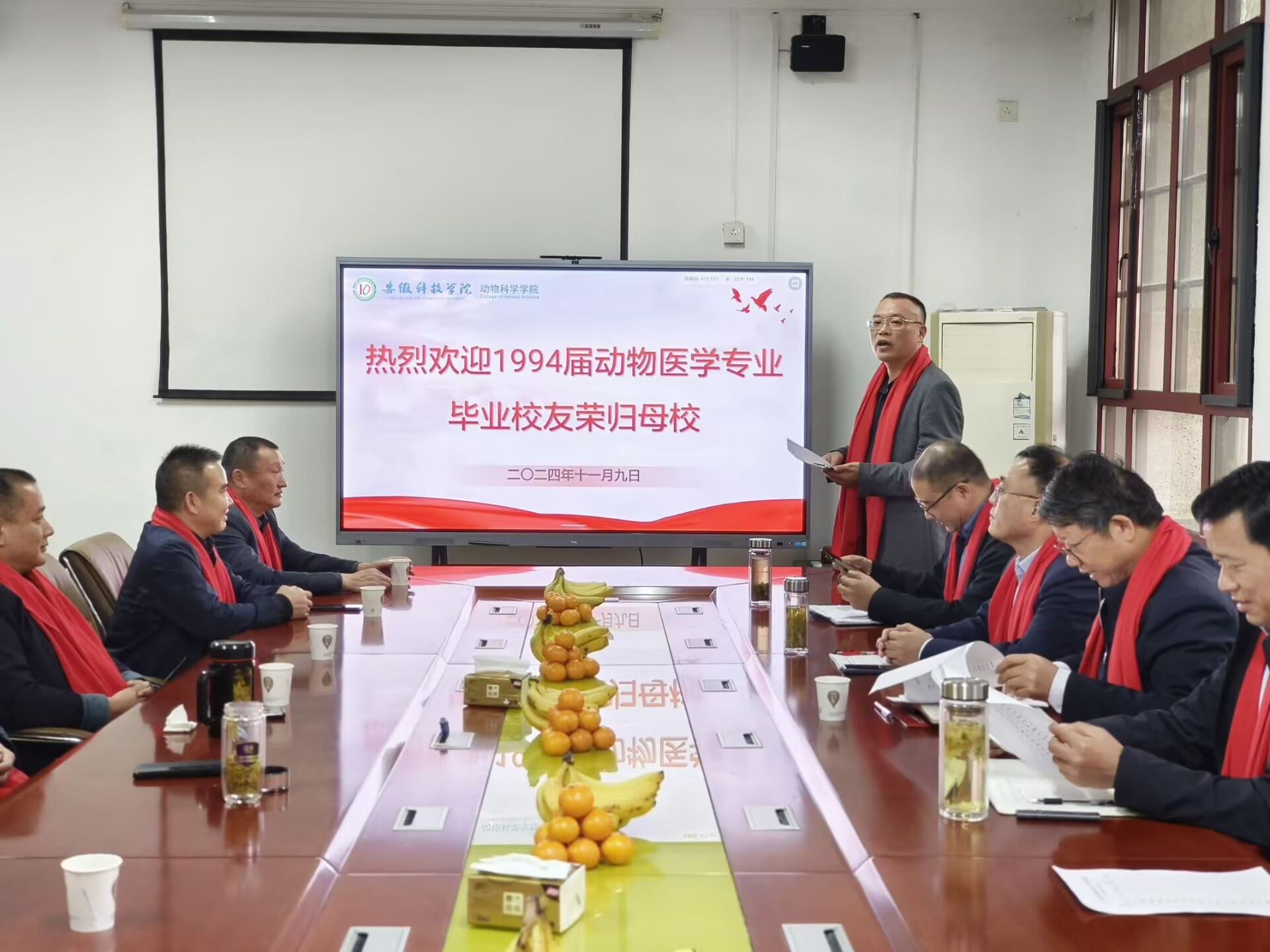 11月9日下午,动物医学专业1994届毕业校友荣归母校座谈会在凤阳校区西办公楼104室召开,校党委副书记、院长李升和,原校党委书记蒋德勤,招生与就业工作处副处长(主持工作)何晓冬,机械工程学院党委书记、时任班主任姚勇,动物科学学院党委书记程斌,动物科学学院党委副书记、副院长(主持工作)周金星和教师代表等出席会议,座谈会由校友代表张萍主持。
