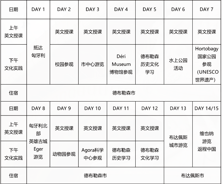 本届夏季游学营以体验欧洲教育与文化和强化英语学习为主,融入德布勒森大学校园生活,与匈牙利师生广泛交流;组织参观德布勒森、布达佩斯、英雄古城、博物馆、动物园、科学中心、水上公园、国家公园(联合国文化遗产)以及奥地利首都维也纳等。
