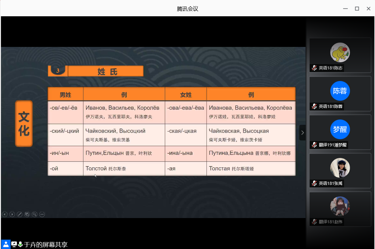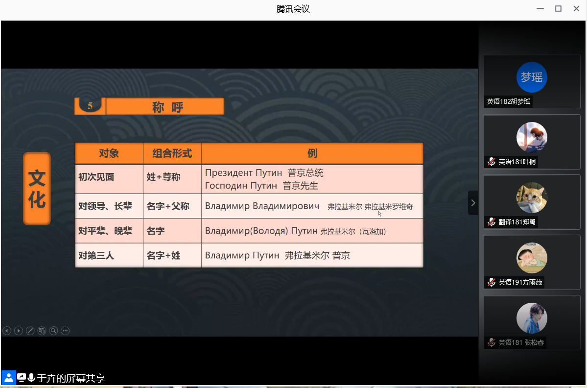 于卉老师从三个方面向同学们展示俄罗斯文化的魅力。一是俄语,语言是沟通的钥匙,是文化的载体,也是民族的重要特征之一,于卉老师详细介绍了俄语的发音和语法;二是姓名文化,俄罗斯人姓名一般由三节组成,分别为本人名字、父称和姓氏。而小名和爱称用于关系更加密切的人们之间,昵称则是日常生活中比较随便和不客气的称呼法,随使用者的关系和语气而含有不同的意味;三是旅游景点,于卉老师向我们展示了红场、瓦西里升天大教堂、列宁墓、夏宫、埃尔米塔什博物馆等俄罗斯著名景点,独特的建筑结构和雕刻手法,使俄罗斯建筑更具有民族特色。在听完精彩的讲座之后,同学们都热情饱满、积极提问,于卉老师耐心、细致地针对每位同学的问题进做出解答,使得同学们对俄罗斯文化有了更进一步的了解和认识。