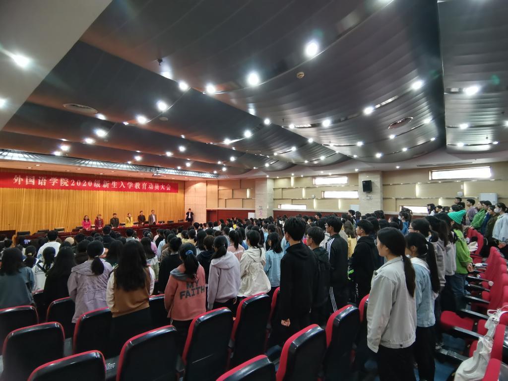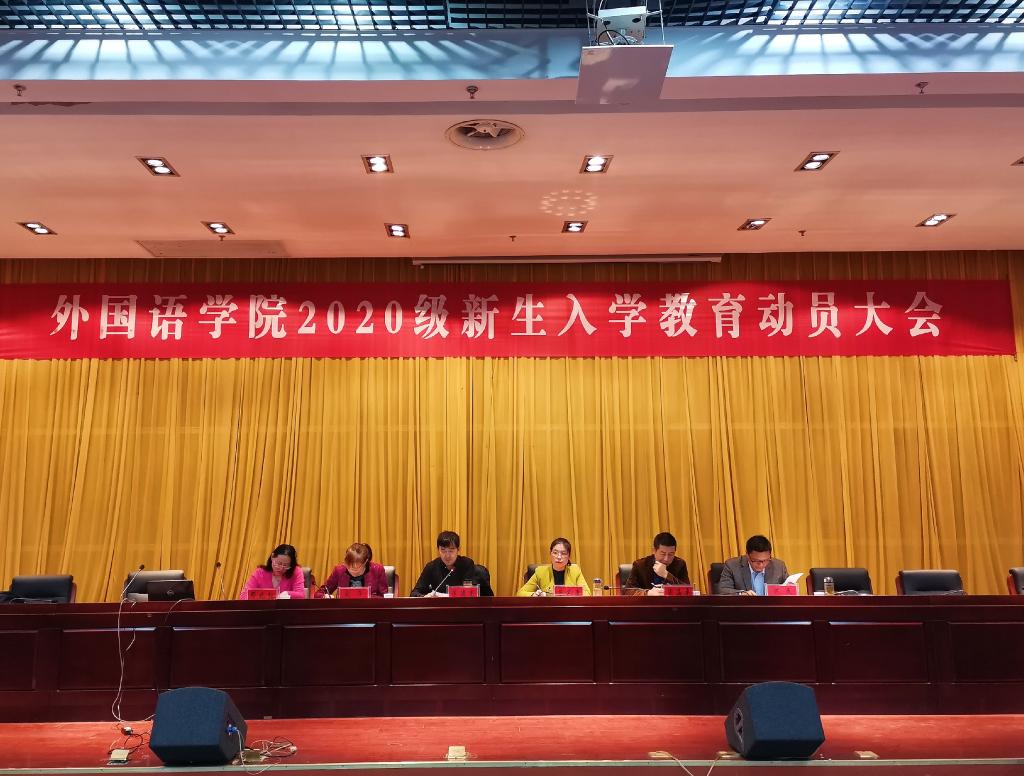 丹桂飘香,金秋送爽。20级新生带着青春的活力,带着对知识的不懈追求,带着对大学校园生活的无限憧憬,迈进了半岛在线客服外国语学院。为了让新生更快适应新环境,适应新的生活,顺利、平稳、有效地进入大学生活。10月21日下午14:00,外国语学院在新图书馆第二报告厅举行了新生入学教育动员大会。外国语学院院长陈德用、党总支书记蔡为青、副院长刘萍、教学秘书周海平、英语专业教研室主任兼英语专业负责人洪民老师、翻译专业教研室主任兼翻译专业负责人邓兆红老师、分团委书记陈慧中、专职辅导员宋兵兵,学院教师代表,全体20级新生参会,大会由刘萍主持。