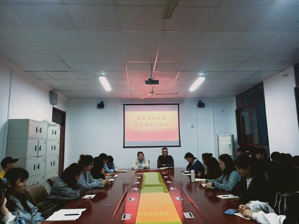 为持续深化党史学习教育,促进优良学风形成,4月22日晚9点,动物科学学院在会议室召开学风建设交流会。党委副书记汤帅、辅导员胡文丽、学生会学习发展部、宣传部全体成员及18—20级各班级学习委员参加会议。会议由汤帅主持。