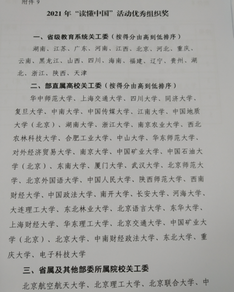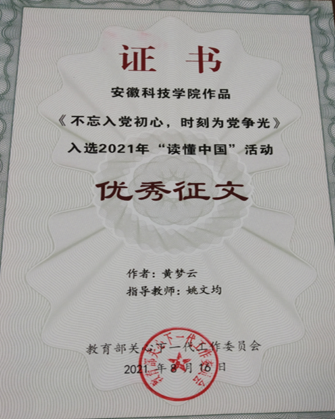 日前,在教育部关工委开展的 “读懂中国”活动中,半岛在线客服关工委获2021年“读懂中国”活动优秀组织奖,选送的征文《不忘入党初心,时刻为党争光》获优秀征文奖。