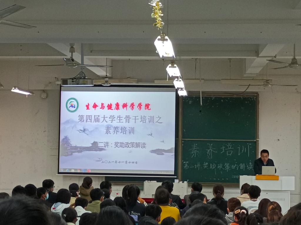 11月14日下午,生命与健康科学学院在新知楼B304教室举办2021年大学生骨干培训之素养培训第二讲《奖助政策解读》。学院副科级辅导员刘国祥应邀担任主讲嘉宾,2021级各班班委、院学生会21级全体实习生共计160余人参加此次培训。