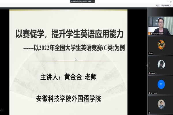 为提高我校学生英语语言综合应用能力,帮助广大报名参赛同学熟悉题型、顺利迎接考试,助力我校学生备考2022年度全国大学生英语竞赛,外国语学院于4月7日19:00举办了全国大学生英语竞赛专题辅导讲座。讲座通过腾讯会议线上举行,由外国语学院大学英语第一教研室黄金金老师主讲,100多名同学全程参加了线上讲座。讲座由外国语学院大学英语第一教研室党支部书记李润润主持。