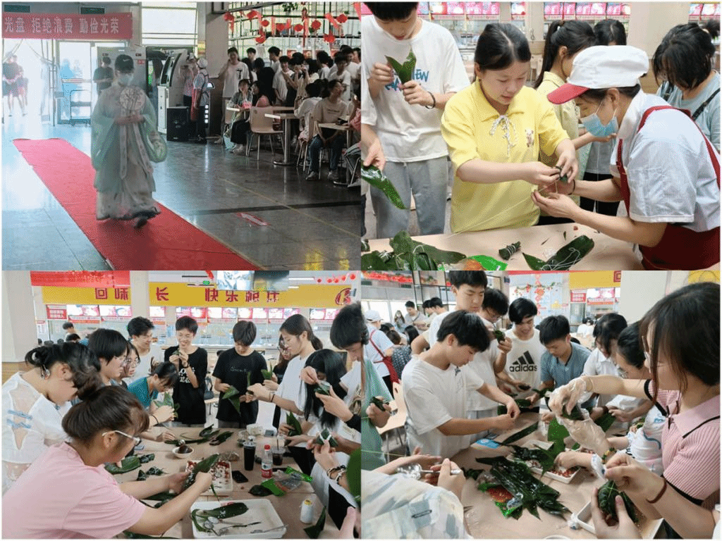 下午,学院在学校西区食堂进行了“粽”享端午—包粽子比赛展示活动。在走进食堂时,各班级还进行了走秀表演,在轻松愉快的音乐背景下,大家走上红地毯,摆出造型,展现青春魅力,现场掌声与欢呼声此起彼伏。随后进行的包粽子比赛,同学们在食堂阿姨的耐心教学下,大家围在一桌,发挥想象,包出了各种造型和味道的粽子,体验了包粽子的乐趣,期间大家还相互分享着家乡的端午节习俗,讲述自己经历的端午故事,欢声笑语不断。