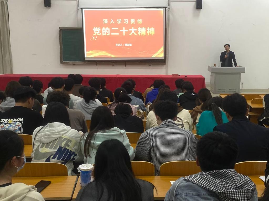 傅友福为全体学生党员干部讲授了以《深入学习贯彻党的二十大精神》为题的主题党课,重点解读了党的二十大主题和主要成果、过去五年工作和新时代十年伟大变革的重大意义、马克思主义中国化时代化、中国式现代化、全面建设社会主义现代化国家的目标任务、坚持党的全面领导和全面从严治党等方面内容。同时,他对学生干部提出了几点希望:一是勤学习,多实践。全面准确学习领会党的二十大精神,切实用党的二十大精神武装头脑、指导学习实践。二是重务实,勇当担。学生党员干部要勇于担当、攻坚克难,自觉把责任放在心上、扛在肩上,甘于奉献,做出榜样。三是知敬畏,守规矩。学生党员干部要坚持发扬斗争精神的鲜明品格,时刻守底线、知敬畏,守纪律、讲规矩,始终牢记党员的初心和使命。四是要加强锻炼,提高身体素质,为成长成才打下坚实的基础。