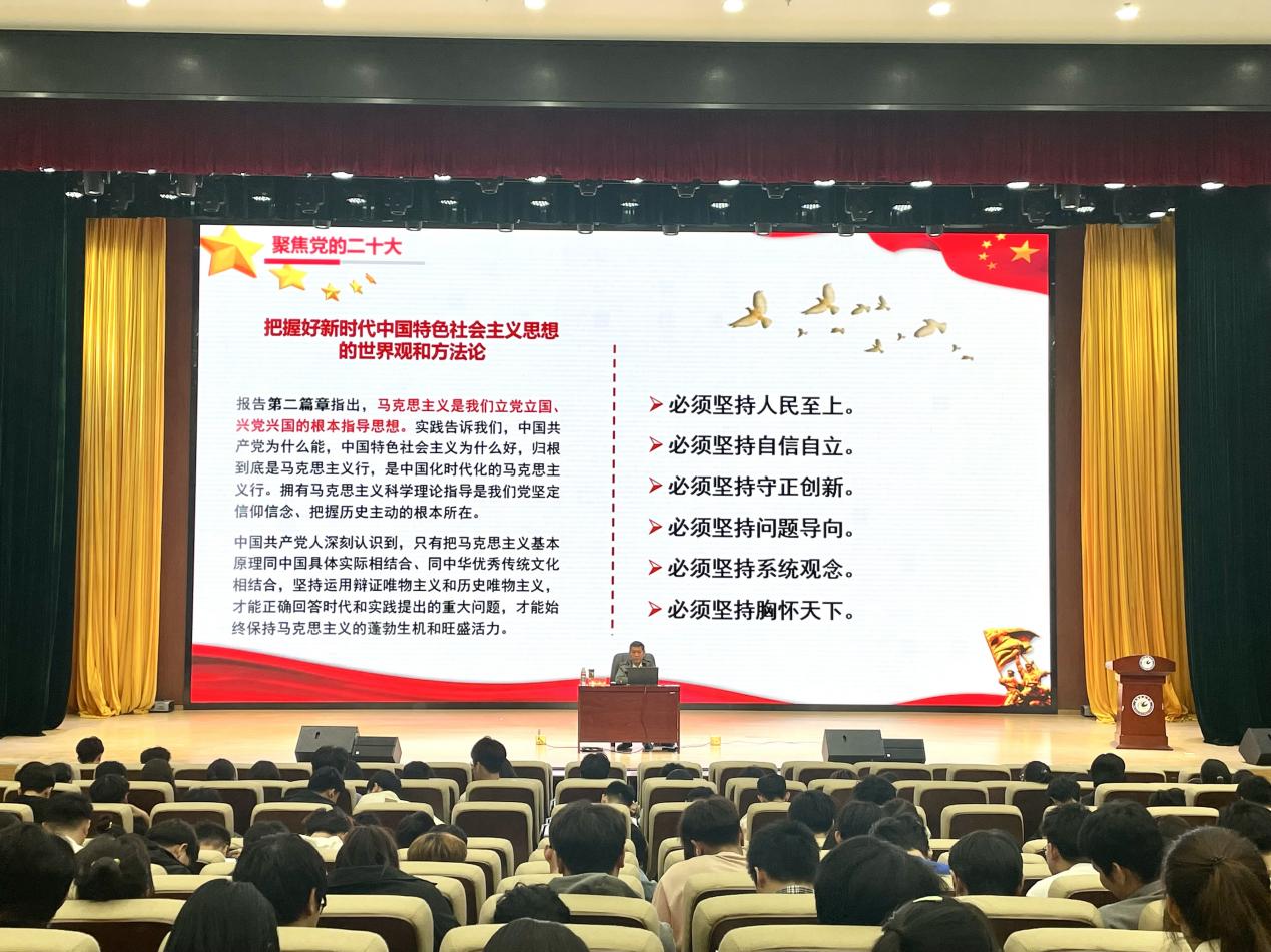 黄树桥详细介绍了党的二十大报告主要内容,系统梳理了党的十八大以来取得的辉煌成就,深入讲解了新时代新征程中国共产党的使命任务,重点解读了党的二十大报告中“实施科教兴国战略,强化现代化建设人才支撑”的内容,教育引导广大青年深入学习领会习近平新时代中国特色社会主义思想,立足当前,勤奋学习,勇于实践,将青春献给伟大的中国特色社会主义新时代。讲座中,他还结合近年来学校事业发展所取得的显著成就,介绍了学校“三步走”战略,并展示了学院近年来在人才培养、科学研究、文化传承创新和服务社会等方面取得的成就。他希望同学们在华夏盛世中更应知责奋进,肩负重任时更应顶压前行,在新时代努力做一个既敢于担当、胸怀大局,又脚踏实地、刻苦学习,更心怀感恩、懂奉献的优秀青年。