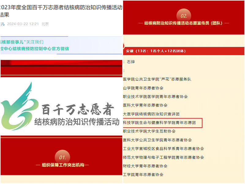生命与健康科学学院团委自2020年获批安徽省大学生志愿者团体培育计划资助以来,一直秉承“奉献、友爱、互助、进取”的志愿者精神,在校内外积极开展各类志愿服务活动。今年的3月24日是第29个“世界防治结核病日”。生命与健康科学学院青年志愿团已连续7年开展“世界防治结核病日”主题宣传活动。2024年度“安徽省大学生志愿者团体培育计划”评选结果出炉,该团体获得一等资助。同时,该团体分别荣获2023年度安徽省和全国百千万志愿者结核病防治知识传播活动优秀志愿者团体称号,据悉获得全国百千万志愿者结核病防治知识传播活动优秀志愿者团体称号的安徽省有12个。未来,生命与健康科学学院青年志愿团将继续为打造健康校园,共创美好未来而努力奋斗。(特约通讯员:王传林 摄影:朱琦 谢佳梦 陈子涵 卢莲莲 杨青柳 审核:彭丽萍 编辑:李锦)