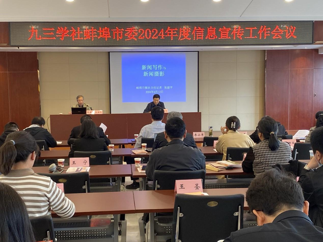 由九三学社蚌埠市委员会副主委李小军主持,4月12日下午在蚌埠市党派楼七楼会议室举行了九三学社蚌埠市委2024年度信息宣传工作会议。此次会议特邀蚌埠日报社主任记者张建平为与会者讲授“新闻写作与新闻摄影”知识。本次学习活动中,我校九三学社社员王晔参加了学习。