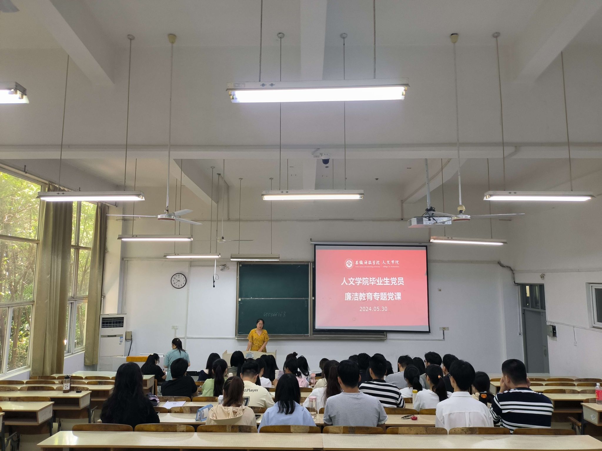 为引导毕业生党员进一步筑牢清正廉洁思想根基,涵养廉洁自律政治品格,培养高尚道德操守,系好廉洁从业的“第一粒扣子”,5月31日中午,人文学院党委副书记李沙娜在求知楼A107以“不忘初心, 廉洁从业, 砥砺前行”为题,为全体毕业生党员讲授廉洁教育主题党课。