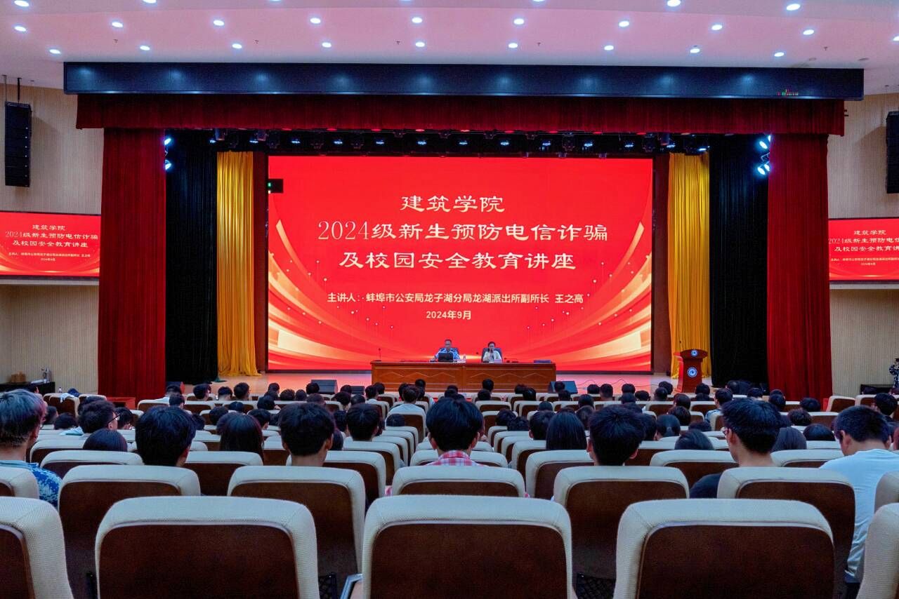 “无安全则教育难继,失生命则未来无依”。为加强2024级新生的安全教育,全面提升新同学的安全防范技能,9月12日,建筑学院在东辅楼报告厅开展了以“防范电信诈骗 筑牢校园安全”为主题的安全教育专题讲座。讲座由蚌埠市公安局龙子湖分局龙湖派出所副所长王之高主讲,建筑学院团委书记沈德艳主持,全体新生辅导员及2024级新生参加。