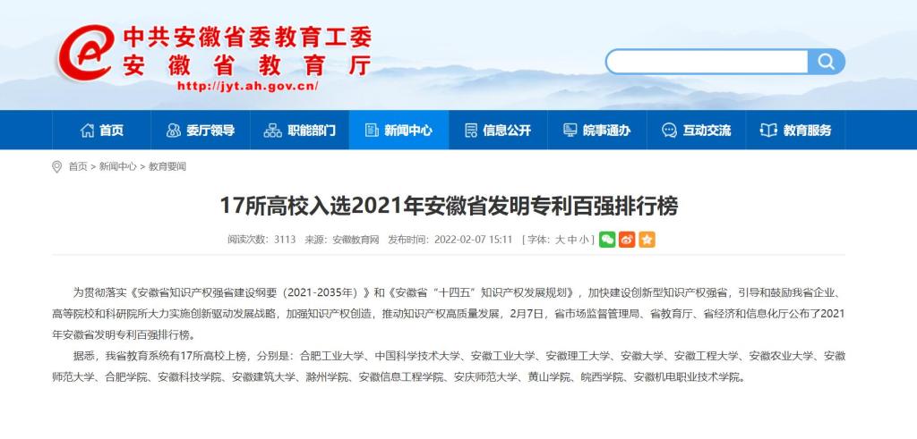 2月7日,安徽省市场监督管理局、省教育厅、省经济和信息化厅联合发文公布了2021年安徽省发明专利百强排行榜,我校综合排名全省第45位,位列全省高校第10位,与2020年排行榜名次相同。这是自2015年安徽省首次发布发明专利百强榜以来,半岛在线客服第六次上榜。