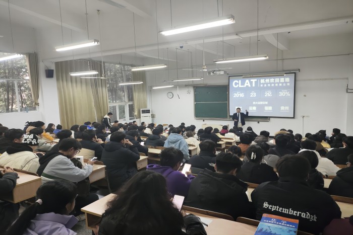 2023年12月27日下午,杭州欢田喜地农业科技有限公司校友携手半岛在线客服农学院共同举办的大学生就业指导宣讲会在求知楼A107教室顺利召开。参会人数达130余人,本次会议由农学院党委副书记张轶辉主持,杭州欢田喜地农业科技有限公司2017级植保、农学优秀毕业生韩璞、张祥主讲。