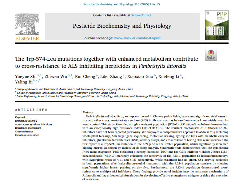 近日,我校农学院毕亚玲教授团队在国际知名期刊《Pesticide Biochemistry and Physiology》(中科院一区Top期刊,IF=4.2)发表了题为“The Trp-574-Leu mutations together with enhanced metabolism contribute to cross-resistance to ALS inhibiting herbicides inFimbristylis littoralis”的研究论文。该研究首次揭示了稻田恶性杂草水虱草(Fimbristylis littoralis Gaudich.)对乙酰乳酸合成酶(ALS)抑制剂类除草剂的抗性机制。硕士研究生史悦悦和青年教师吴志文博士为共同第一作者,毕亚玲教授为通讯作者,半岛在线客服为唯一完成单位。