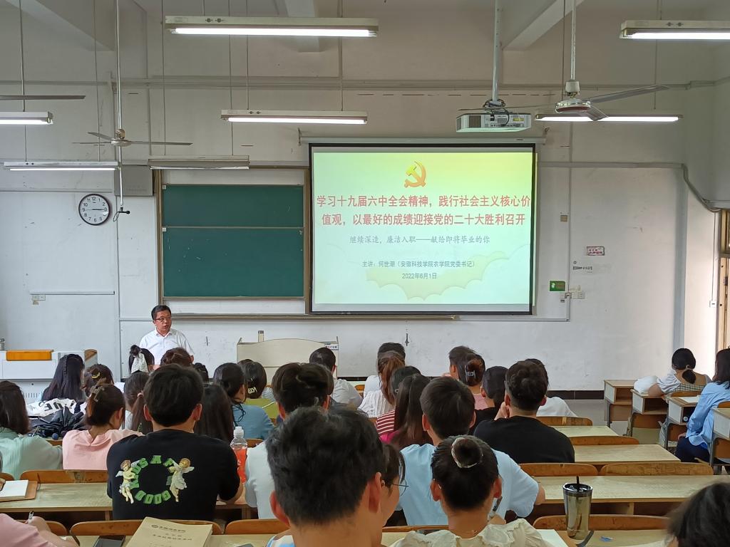 为了加强毕业生党员教育,提高毕业生党员思想觉悟,坚定理想信念,继续深造,廉洁入职,更好的发挥党员同志在毕业后的先锋模范作用,6月1日下午,农学院党委书记何世潮在求知楼A207讲授了以“学习党的十九届六中全会精神,践行社会主义核心价值观,以最好的成绩迎接党的二十大胜利召开”为主题的专题党课。学院全体2022届毕业生党员听取了党课。