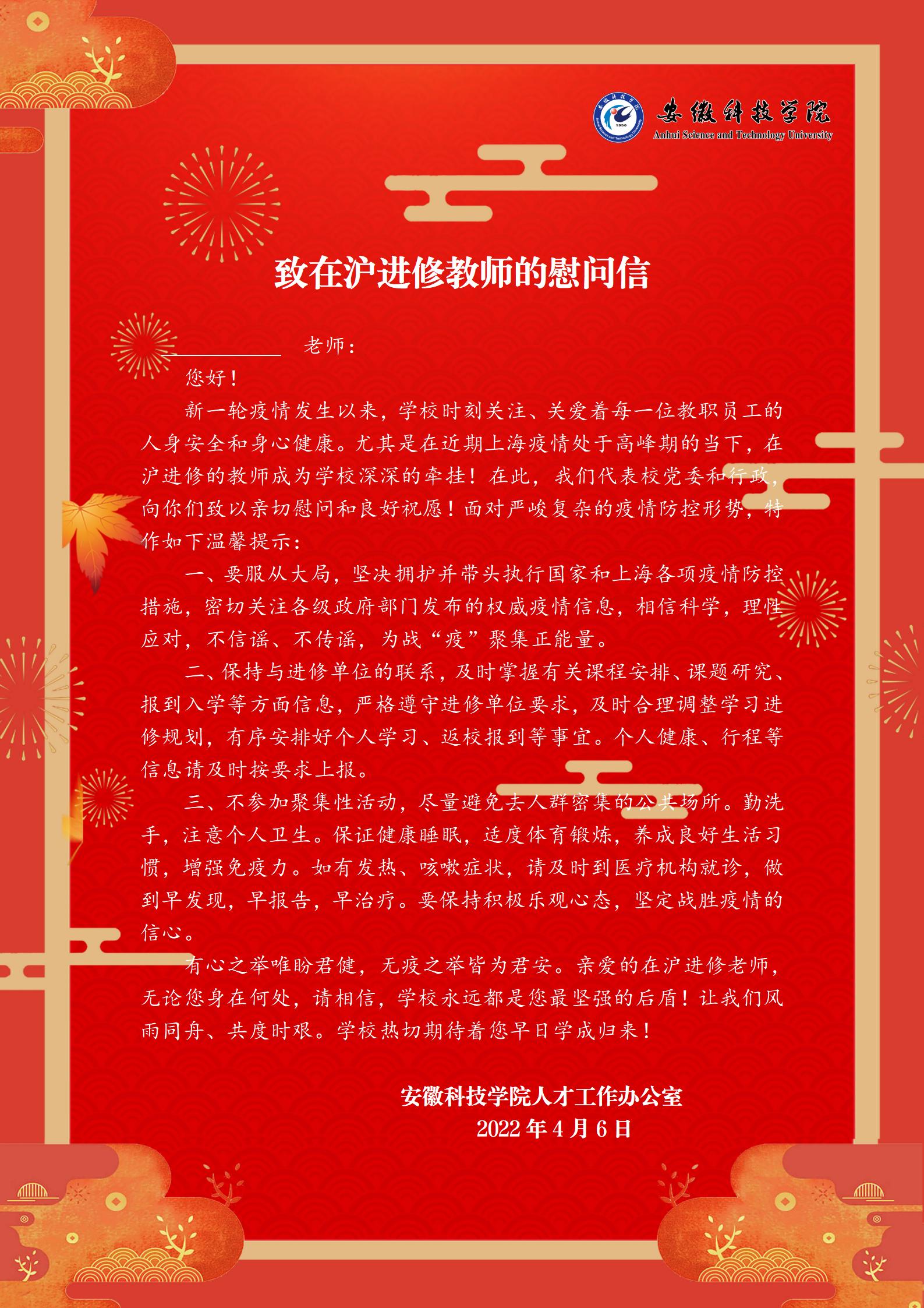 在慰问信中,校人才办向他们致以学校党政的亲切慰问和良好祝愿,同时就如何配合做好属地疫情防控工作进行温馨提示,号召他们服从大局,坚决拥护并带头执行国家和驻地各项疫情防控政策;保持与进修单位的联系,合理有序安排好个人学习、工作和生活;注意个人卫生,保持积极乐观心态,坚定战胜疫情的信心。慰问信还深情地指出,“有心之举唯盼君健,无疫之举皆为君安。亲爱的在沪进修老师,无论您身在何处,请相信,学校永远都是您最坚强的后盾!让我们风雨同舟、共渡时艰。学校热切期待着您早日学成归来!”(特约通讯员:常海军  审核:卢星辰 编辑:张威)