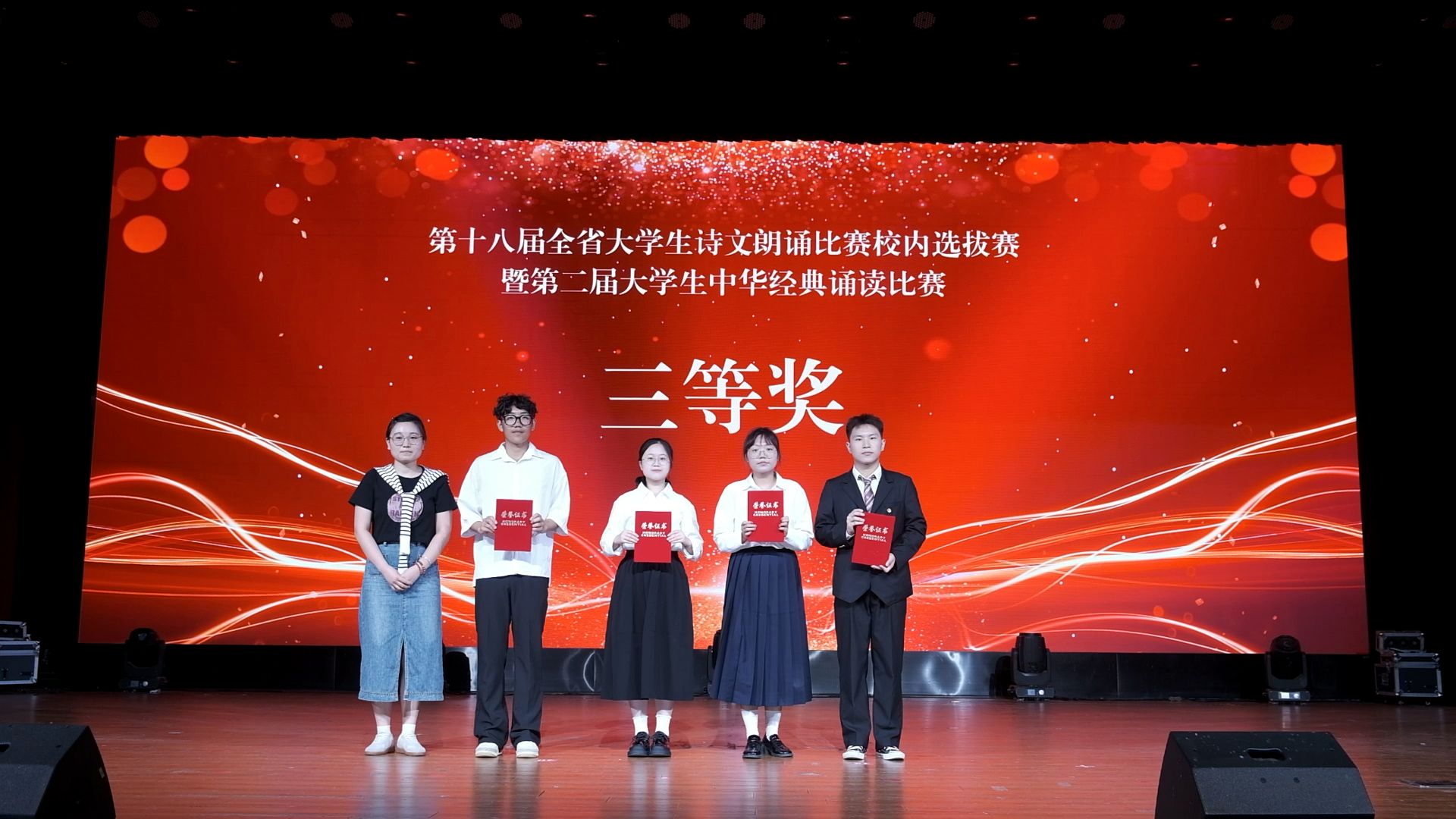 经过精彩的比拼角逐,《时间的入口》(朗诵者:王洋旭)斩获一等奖,《不朽》(朗诵者:李文文)、《我们的青春》(朗诵者:袁雪、唐静静)获得二等奖,《青春中国》(朗诵者:王浩)、《秋天里的中国》(朗诵者:黄勇诚)、《这是一张张怎样的脸》(朗诵者:张馨予)、《诗颂风华》(朗诵者:李子燕、鄢德强、郭甜)获得三等奖。
